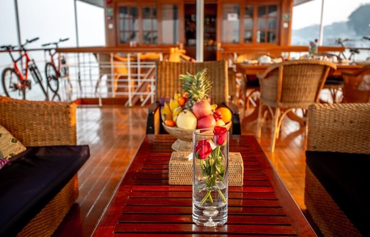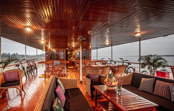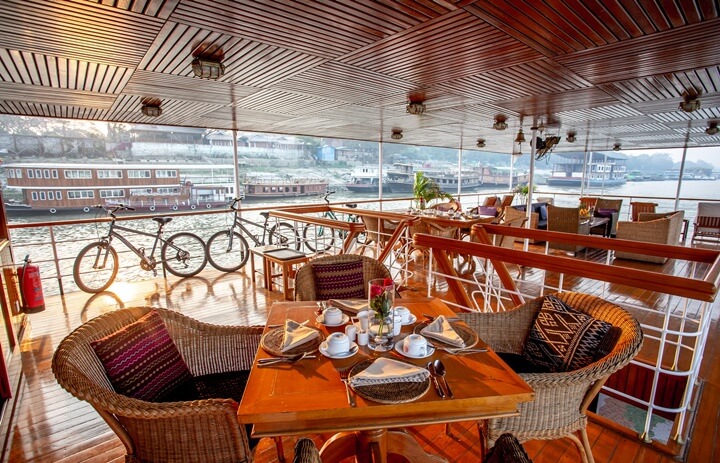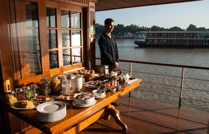 Joining a cruise on Pandaw, you will not only have private space in your comfortable cabin, your journey is also filled with a lot of outdoor experience. There are many vantage points on board allows you to get a panoramic views of the river and observe the world go by such as the promenade decks, observation deck or sitting places outside. The special thing of this ship is that you could open window (except port holes on the lower deck) to enjoy spectacular views while the ship sail forward.