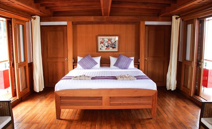 The RV Kalay Pandaw cabins are the most celebrated feature of the Irrawaddy Flotilla Company. Finished in brass and teak, the main deck premium rooms are spacious, offering a panoramic view through French windows.