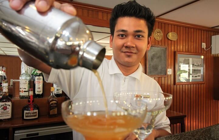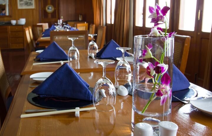 The restaurant offers a great choice of local cuisine and exotic foods. They source supplies as locally as possible, given environmental health regulations. Breakfast and lunch are buffets, and dinner is served at the tables. Passengers who do not like hot or spicy foods are offered European alternatives and vegetarians are well catered for.