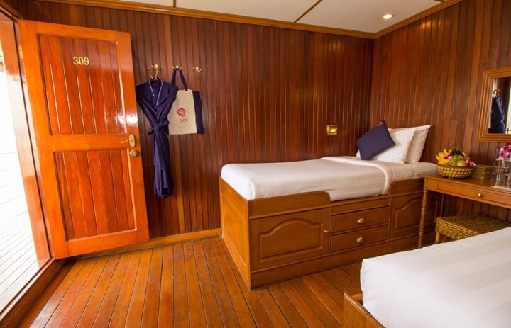 The RV Pandaw II cabins are the most celebrated feature of the Irrawaddy Flotilla Company. Finished in brass and teak, the main deck staterooms are spacious.